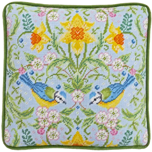 The Spring Blue Tits Cushion Panel Tapestry Kit, by Bothy Threads, is a charming tapestry kit featuring two vibrant blue tits perched within an ornate, foliage-inspired spring design, created by artist Karen Tye Bentley.