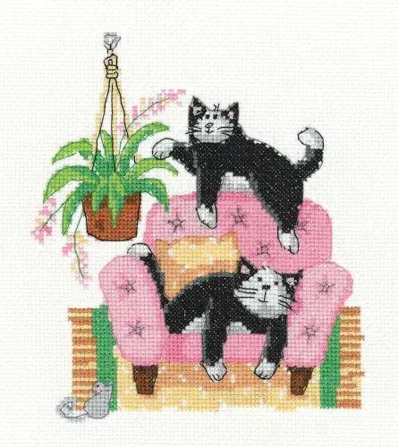 The Playful Cats Cross Stitch Kit, by Karen Carter for Heritage Crafts, is a fun and whimsical design that’s sure to delight any cat lover. Featuring two relaxed, mischievous cats lounging on an armchair while a curious little mouse looks on, this charming scene is full of character and humour.