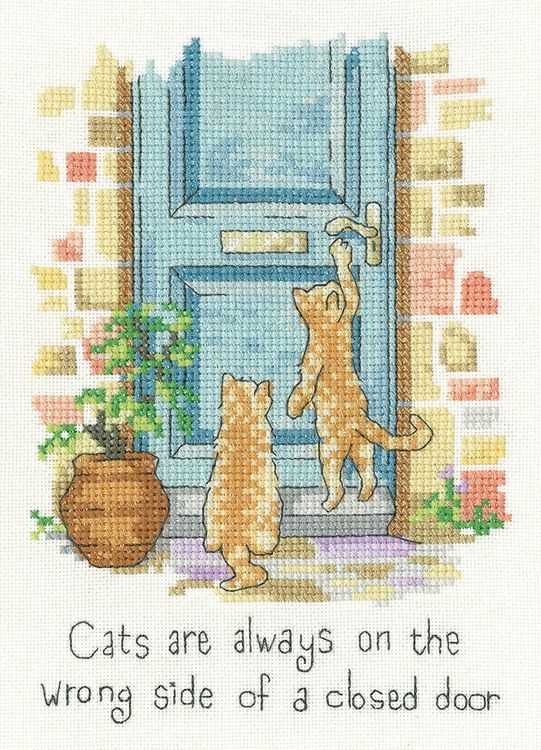 The The Wrong Side Cross Stitch Kit is a must-have for feline fanatics! The unique design features two cats pawing a front door handle and waiting to be let inside along with thoughtful wording to create. Designed by Peter Underhill for Heritage Crafts.