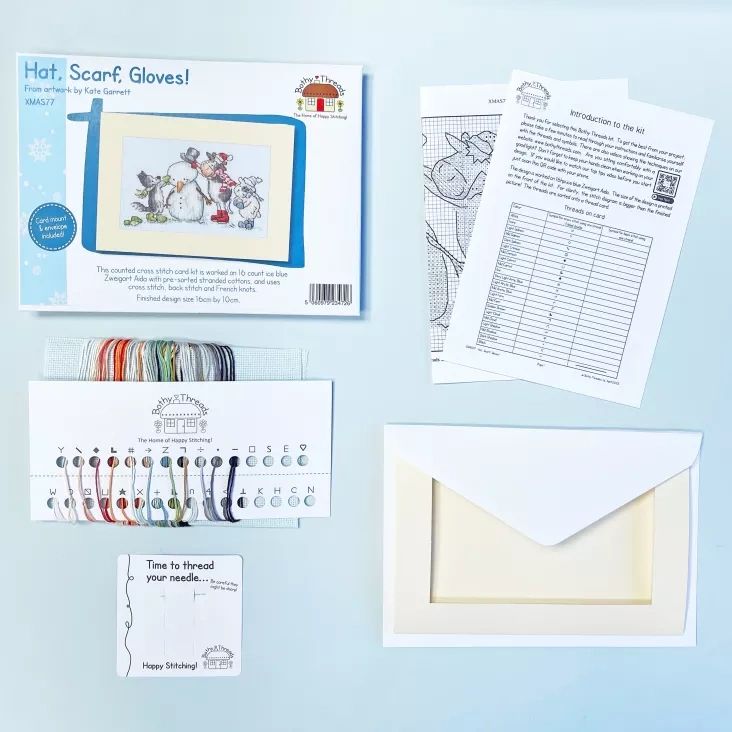 Celebrate the magic of winter with the Hat, Scarf, Gloves! Cross Stitch Kit by Bothy Threads. This heartwarming design captures a playful snowy scene, bringing festive charm and cosy vibes to your handmade Christmas cards.