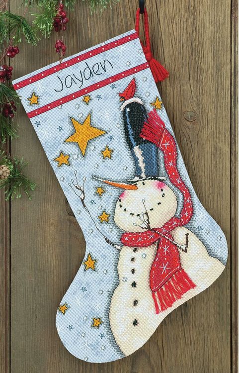 There's always a way to make your snowman stand out, and as this cross stitch stocking kit shows, it can be something as simple as an extraordinarily tall hat!