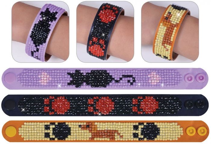 Create three pet themed bracelets with this unique Diamond Dotz craft set. All you need to do is apply the assorted Diamond Dotz using the special stylus to the adhesive foam bracelet and create yourself some cat dog and pawprint themed jewellery.