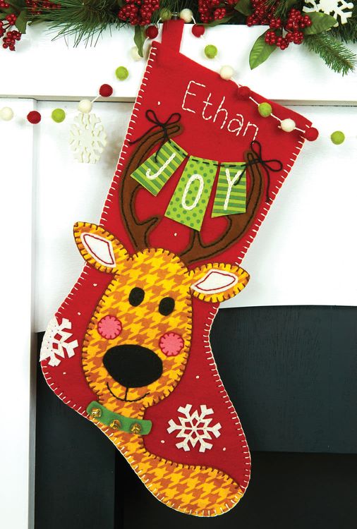 This applique felt stocking kit offers a playful Reindeer design with 'Joy' bunting hung through its antlers. Perfect Christmas stocking for children of all ages. The kit includes easy-to-follow instructions and suitable for any ability.