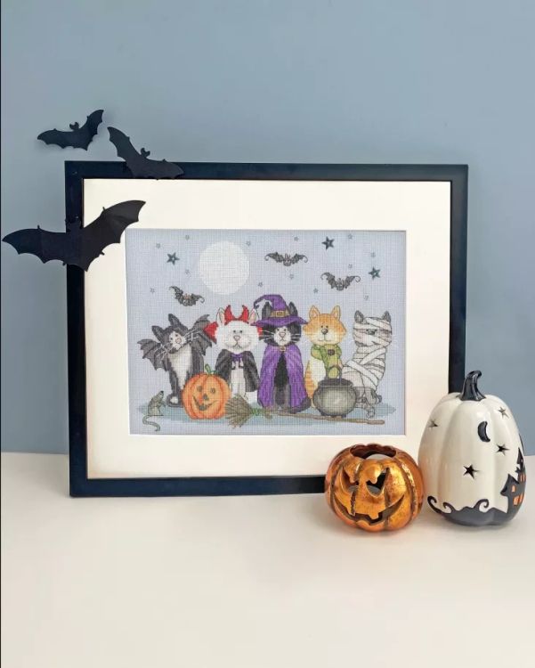 Get ready for some mischievous Halloween stitching with Fiendish Felines, a playful and slightly spooky design by Karen Tye-Bentley. This charming scene features a group of cheeky cats causing havoc among pumpkins and tombstones, under a glowing moon, making it perfect for lovers of both felines and festive stitching.