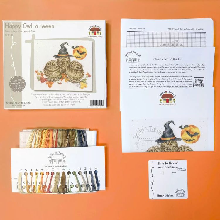 The Happy Owl-o-ween Cross Stitch Kit from Bothy Threads is a delightful seasonal design inspired by original artwork by Hannah Dale of Wrendale Designs. It features three charmingly illustrated owls nestled among autumn foliage, with one sporting a whimsical witch’s hat—perfectly capturing the cosy, playful essence of Halloween with a rustic countryside feel.