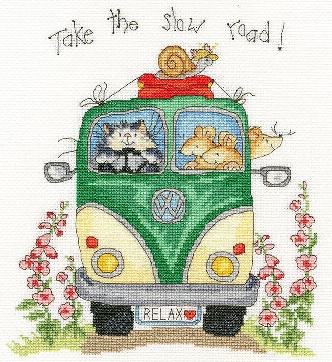 Enjoy the scenery with the Take The Slow Road Cross Stitch Kit from Bothy Threads. Designed by Margaret Sherry, this unique cross stitch kit features a vintage campervan filled with animals riding through a flower-filled country lane.