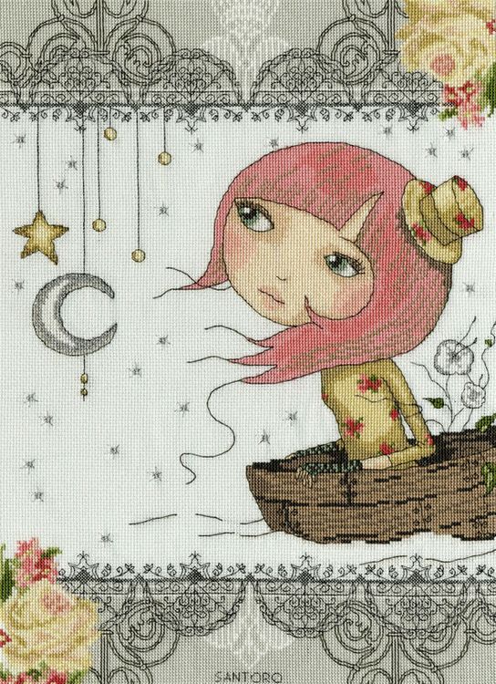 A gorgeous cross stitch kit that captures the endearing nature of childish imagination with its own artistic flair. In this image, the young Mirabelle floats in a sea bathed in starlight and hanging celestial bodies.