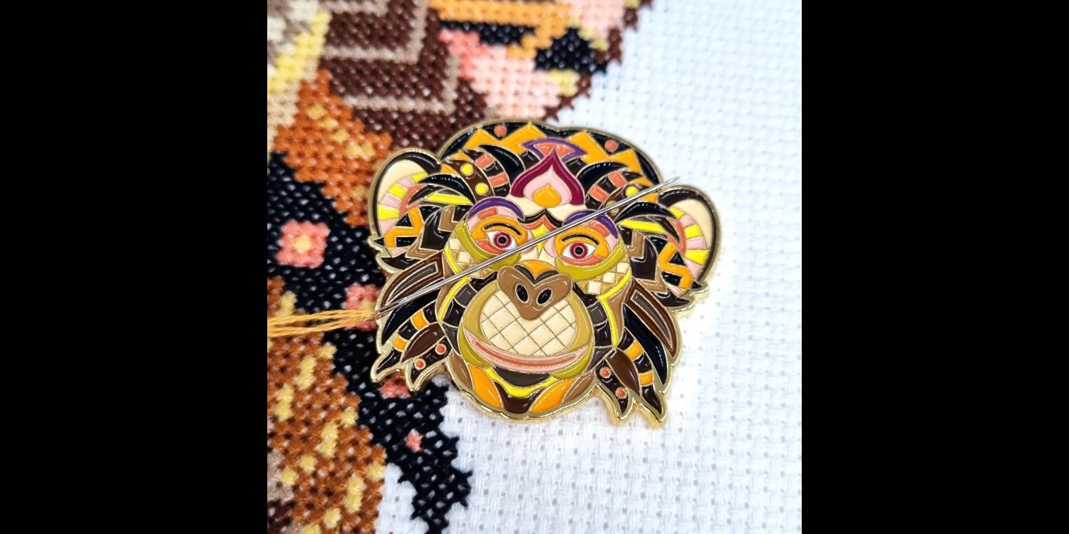 Keep your needles safe and close with the Mandala Monkey Needle Minder, by Meloca Designs. This beautifully crafted accessory features a playful monkey design surrounded by intricate mandala patterns, combining function with artistic flair.