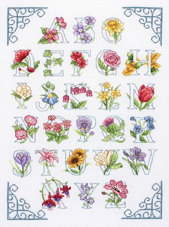 This beautiful floral sampler displays all the letters of the alphabet, each with individual flower designs. This would look great as a sampler, or as inspiration for illuminated lettering on other projects!