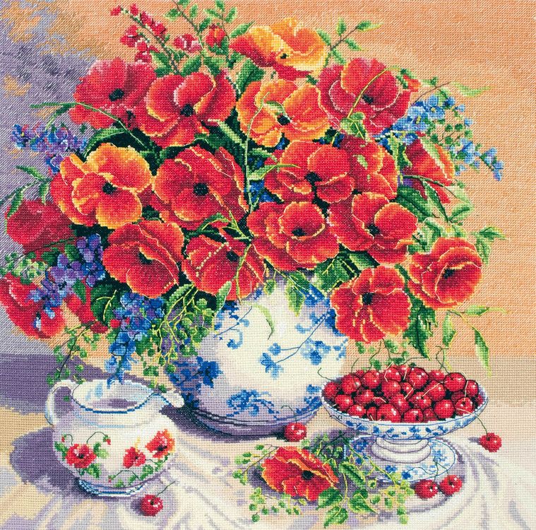 This counted cross stitch kit featuring a bright and cheerful vase of poppies accompanied by red berries would be a highly enjoyable craft project for anyone with a liking for these distinctive red flowers.