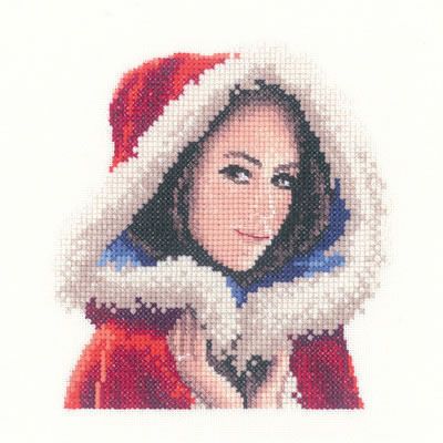 A most festive portrait cross stitch kit from Heritage Crafts, the subject, Scarlett, is dressed in an enticing Mrs Claus robe, complete with a hood for the snowy season.