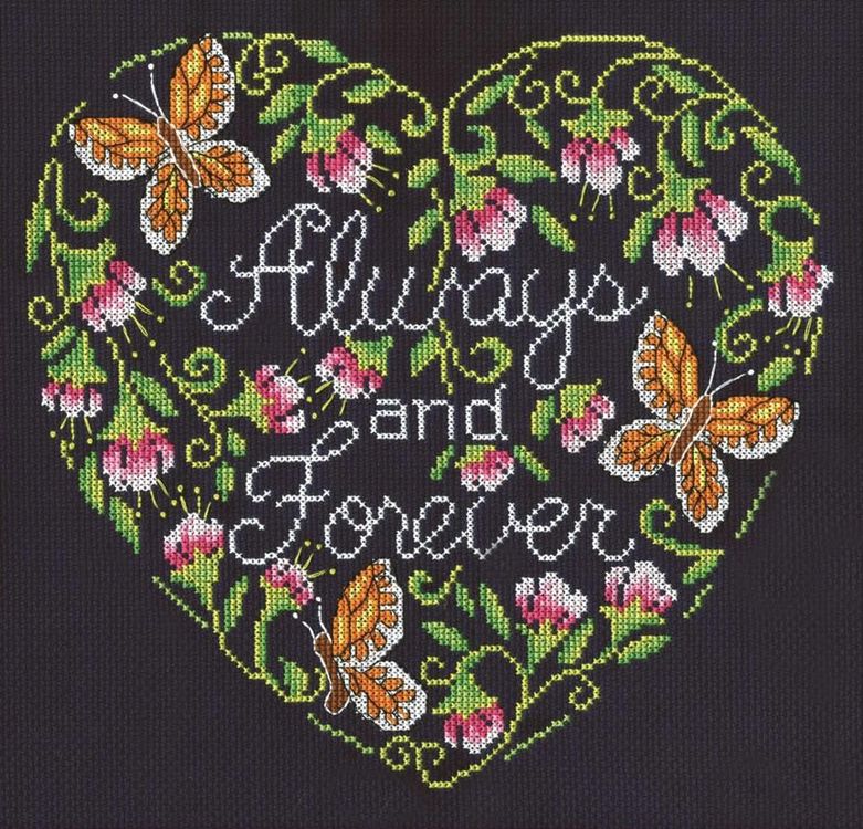 This Always & Forever cross stitch kit would make the most thoughtul present for a family member, loved one or friend. Using navy aida, the embroidered design is a welcomed splash of colour against it, and it features a heart outlined with floral details and the wording 'Always and Forever' within it.