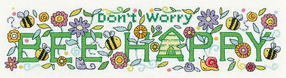 This flowery bumble bee cross stitch kit features a 'Don't Worry Bee Happy' quotation to create and display anywhere in your home. Designed by Karen Carter for Heritage Crafts.