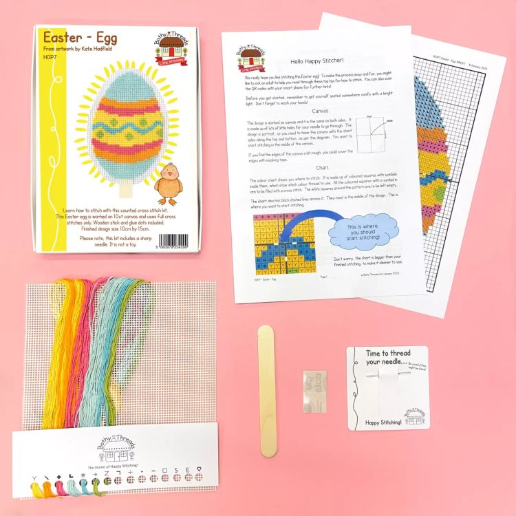 This Easter egg is worked on 10ct canvas and uses full cross stitches only. This kit is based on original artwork by Kate Hadfield, which was first released on the 4th February 2025 as part of the Bothy Threads Spring Collection.