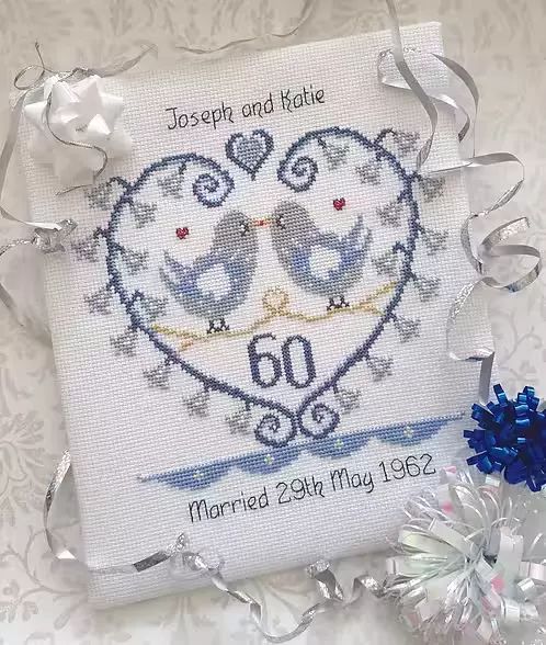 Celebrate 60 years of love with the Diamond Bells Anniversary Cross Stitch Kit! This wedding anniversary sampler featuring two sweet birds together within silver coloured bells, forming a heart. Whether you're creating a keepsake for yourself, or gifting it to a couple on their special day, this cross-stitch kit will be a cherished piece for years to come.
