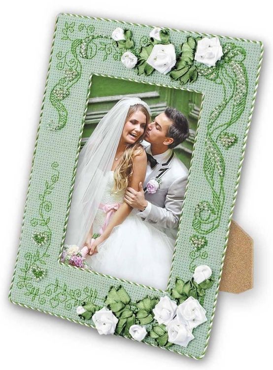 A delightful cross stitch and ribbons photo frame kit, this particular one made for newlyweds, anniversaries and any long standing couple.