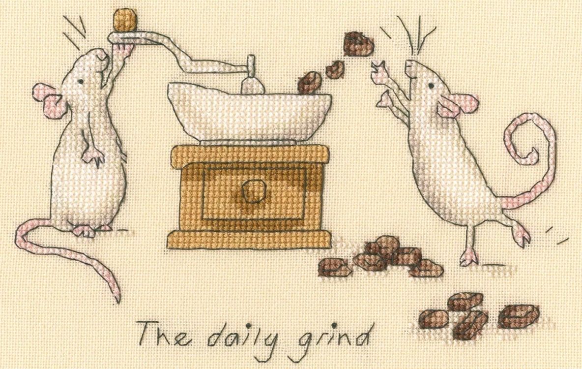 The Daily Grind Cross Stitch Kit by Bothy Threads features a delightful design by popular illustrator Anita Jeram, known for her charming animal artwork.